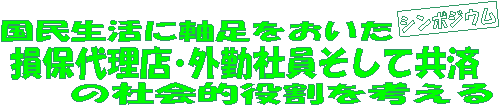| 5/19(火)シンポジウム 損保と共済の社会的役割=第2弾= シンポジウムに137名、懇親交流会に71名 ご参加いただきました。ありがとうございました。 ―世界金融危機と新たな損保再編進行― 新たな大型統合は何をもたらすか? 契約者・代理店・従業員を大切にする産業をめざそう |